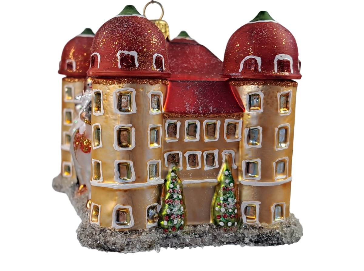 Dieser mundgeblasene und handbemalte Christbaumschmuck aus dem Hause Saico stellt das Schloss Moritzburg aus dem Märchen "Drei Haselnüsse für Aschenbrödel®" dar.